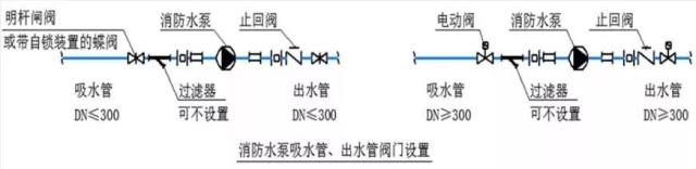 2、消防水泵的出水管,上應(yīng)設(shè)止回閥、明桿閘閥;當(dāng)采用蝶閥時(shí),應(yīng)帶有自鎖裝置;當(dāng)管徑大于DN300時(shí),宜設(shè)置電動(dòng)閥門;